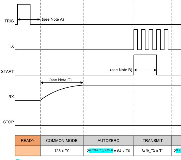 您好,这个时间间隔在datasheet page26的8.4.5.2 TX/RX Measurement Sequencing and Timing有介绍,即Note A 这部分的时间T=3T0+2T1或者T=3T0+3T1. 举例ƒCLKIN = 8 MHz,分频系数TX_FREQ_DIV 为8, 那么周期=1/8Mhz=125ns