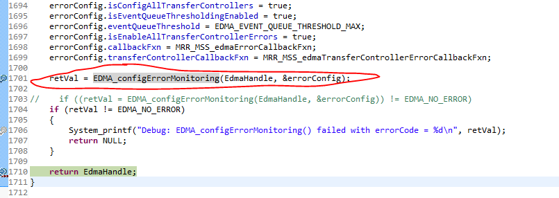 您可以在从CCS调试时进入此功能,并找出设置此错误的确切行。为此,您可能需要映射到CCS窗口中的edma库源代码。