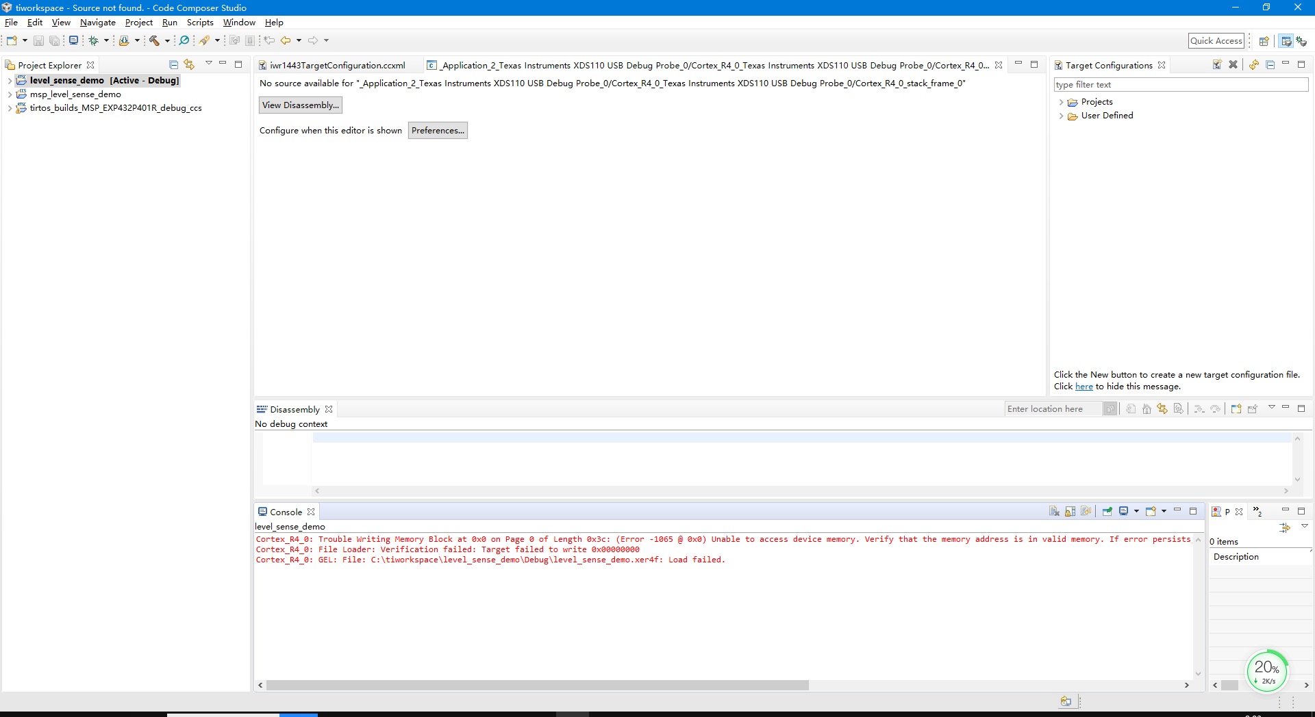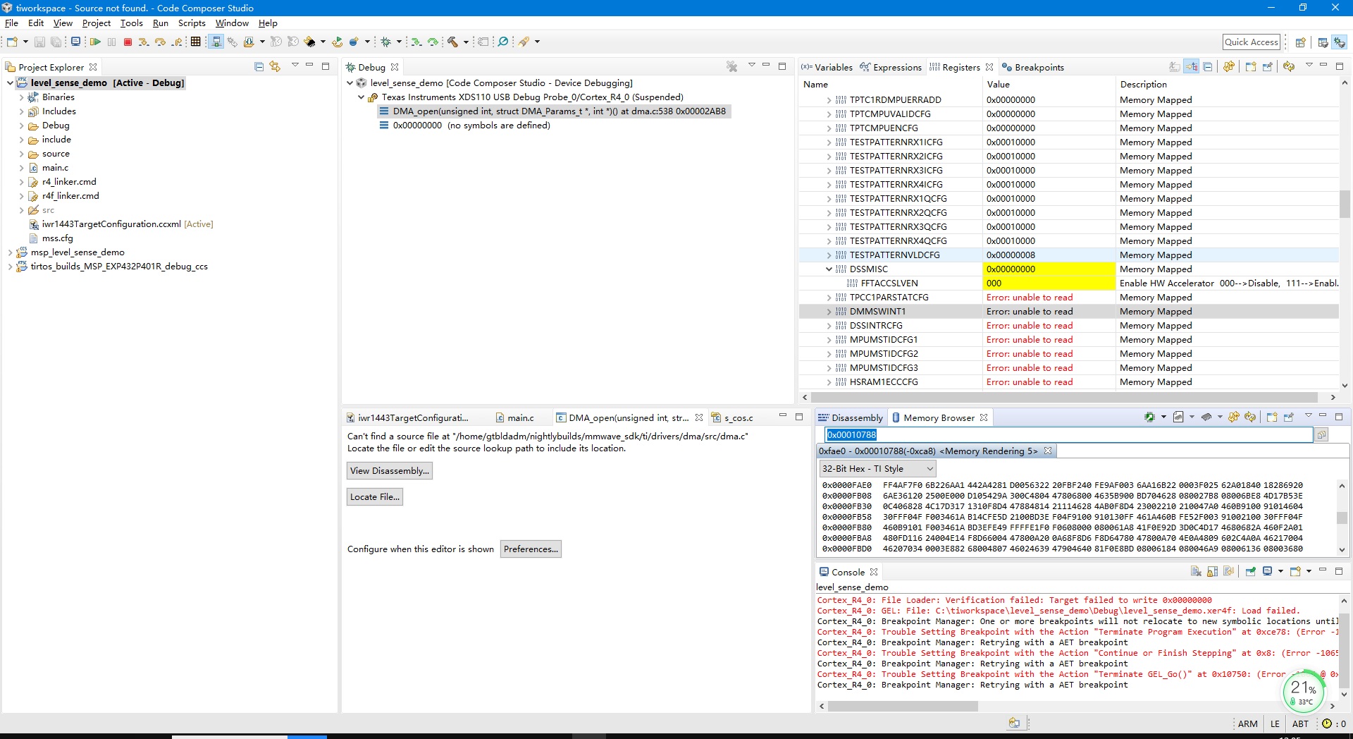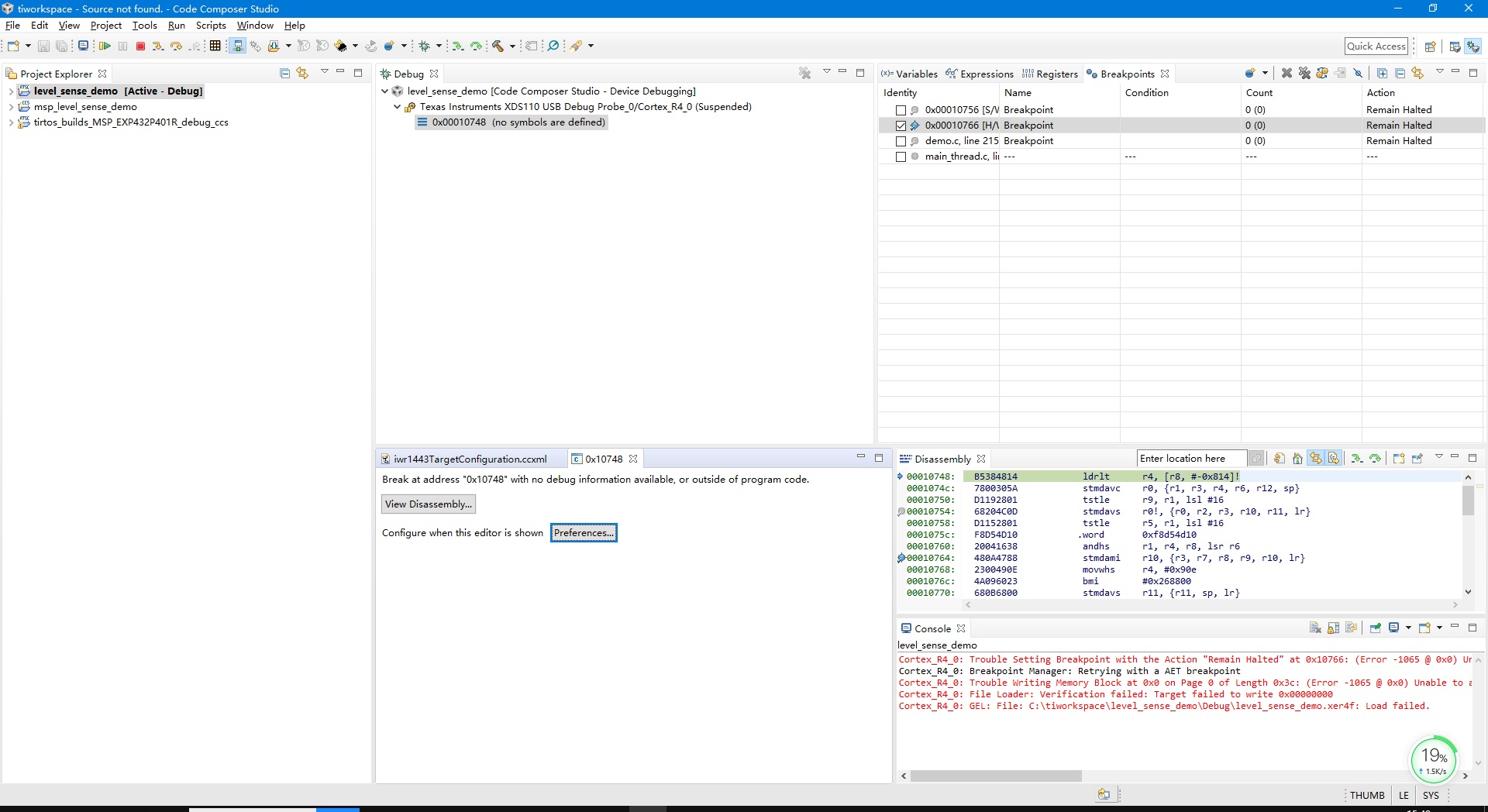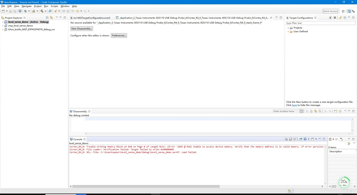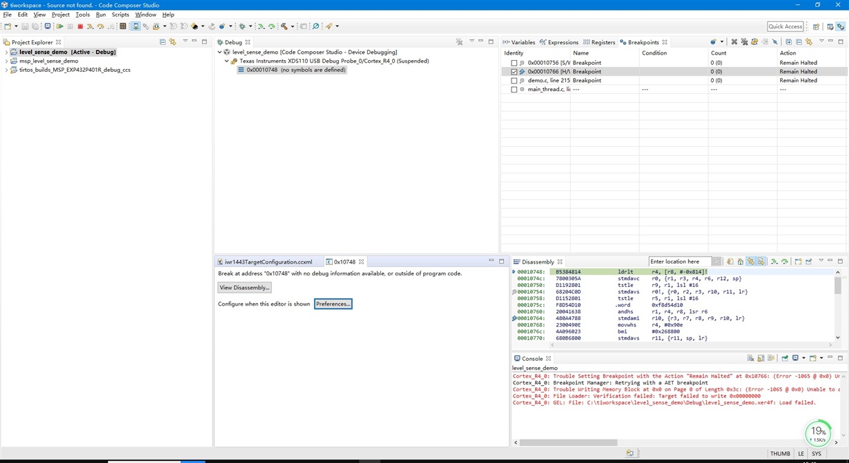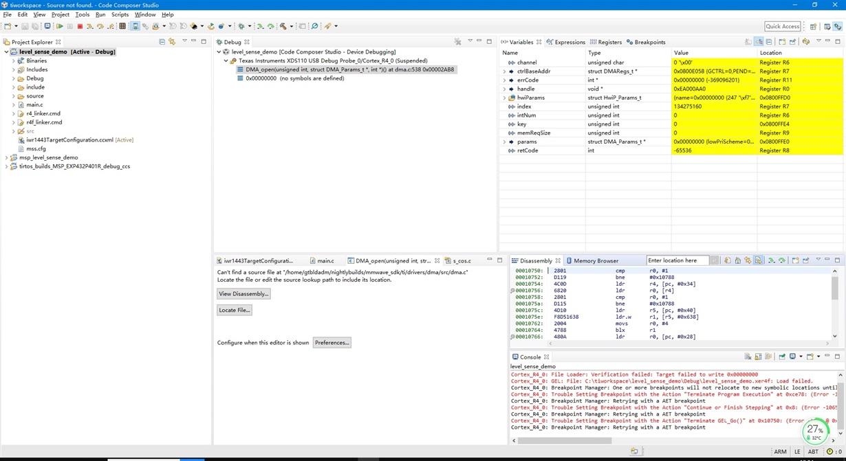 你好,我们在CCS环境下可以连接IWR1443,但LOAD FAILED,而且DISASSEMBLY调试框可以执行部分代码,请多指教。