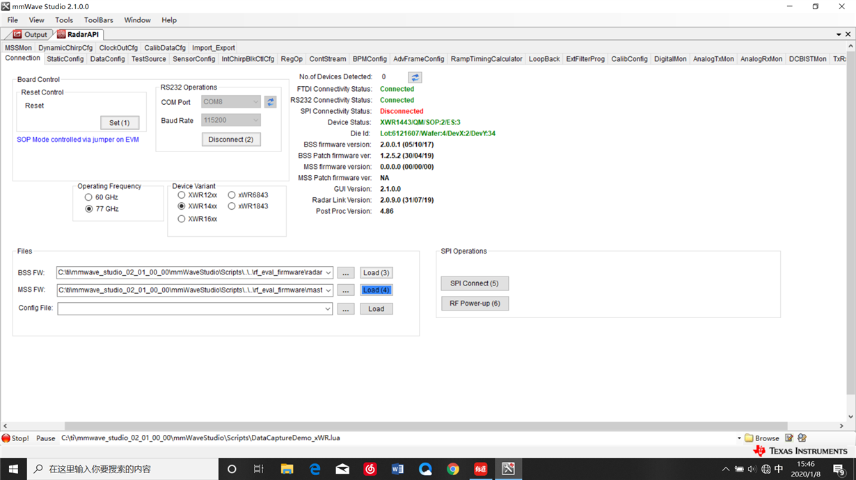 你好,尊敬的专家们,我在将IWR1443Boost与DCA1000连接时,出现了一些问题在studio上SPI一直连接不上,如下图