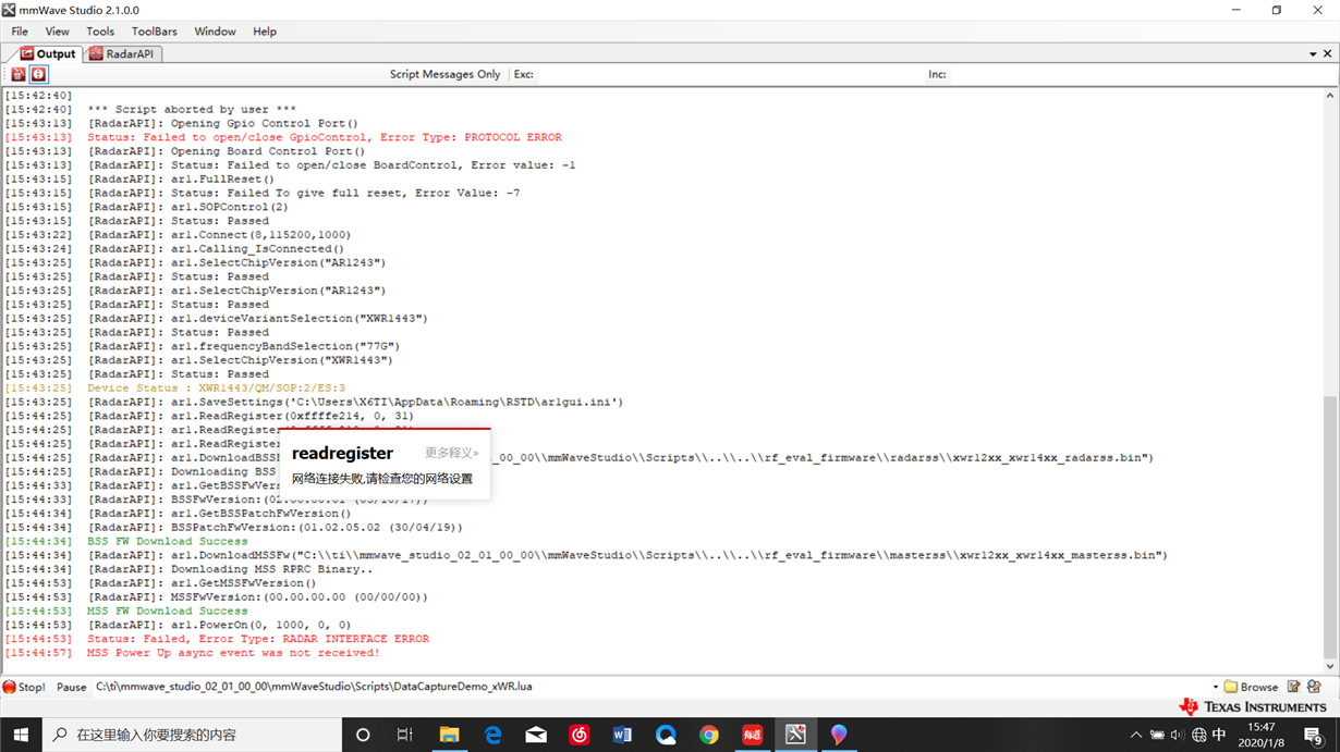 IWR1443Boost与DCA1000连接时出现问题