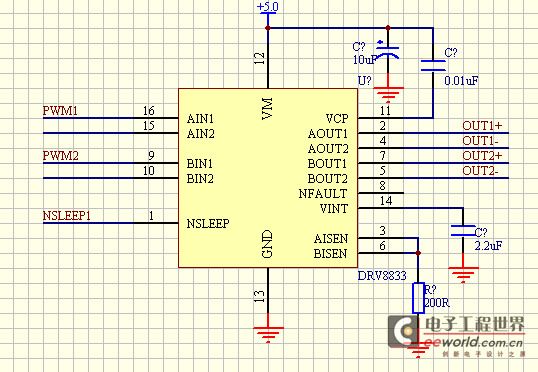 最近在做一个振动电机实验,选用的是扁平电机(手机振动电机)和空心杯电机,驱动芯片选用的是TI的有刷直流电机驱动器DRV8833,按照官方的电路搭了一个电路,外接电压5V,逻辑控制3.3V,发现接上电机毫无反应,测试电压发现电机没接上时,输入脚INX一正一负,两个OUT脚一个5V,一个0V,但接上面任意一种电机OUT输出电压就变成0.3V左右,不知何解,请大家指点指点。我选的扁平电机,卖家说是有刷的。
