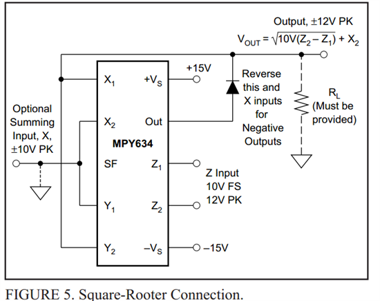 先谢个。请教一下有才之士解答:我用MPY634(芯片在TI官网申请的)做平方根运算电路,电源供电+-12V,电路连接是按照数据表中的图连接的如下图示,其中X2,Y1接地,现在问题有以下: