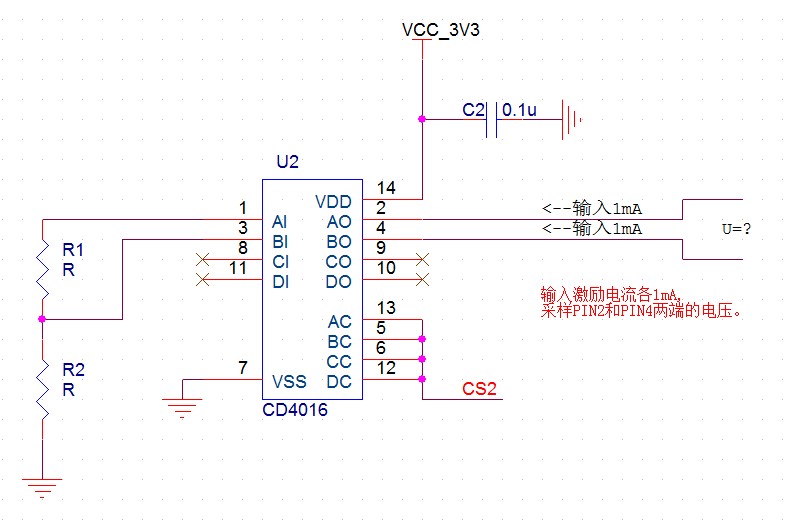 首先,R1为1k,R2为833欧,而电源电压为3.3V,在此情况下CD4016的导通电阻比较大,几百欧到一千多欧的范围,因此误差会非常大。建议您使用TS3A24159,这款电压范围满足您的要求,而且导通电阻非常小。