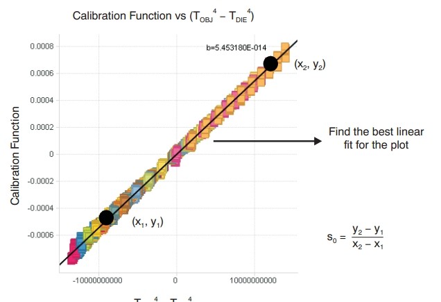 这个图是采用多个TMP006通过测试仪器,根据环境温度,物体温度等多个数据进行试验得出来的结果绘制出来的,这个图的斜率便是S0。