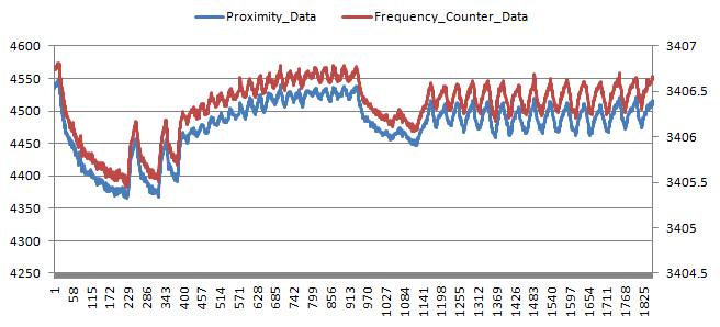 关于LDC1000评估板,想问一下其是否受温度影响?如下图,是在没有任何外围器件测得的Proximity Data和Frequency Counter Data(测量环境开着空调);结果中可以看着Proximity data最小到最大相差差不多200,Frequency Counter Data倒是基本稳定在3406,但是从图中可以很明显地看出其受周围温度(空调)的影响。