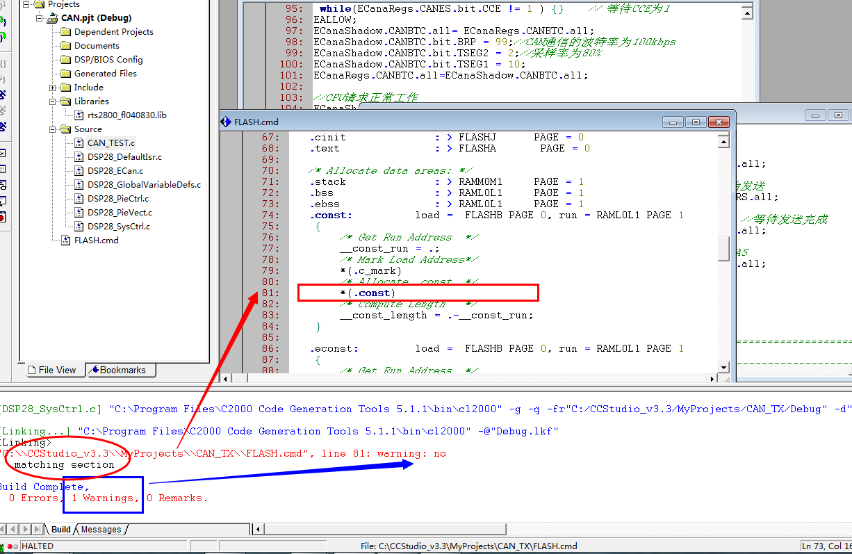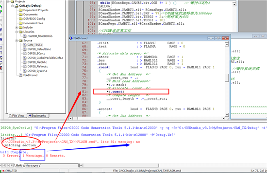 "C:\\CCStudio_v3.3\\MyProjects\\CAN_TX\\FLASH.cmd", line 81: warning: no matching section