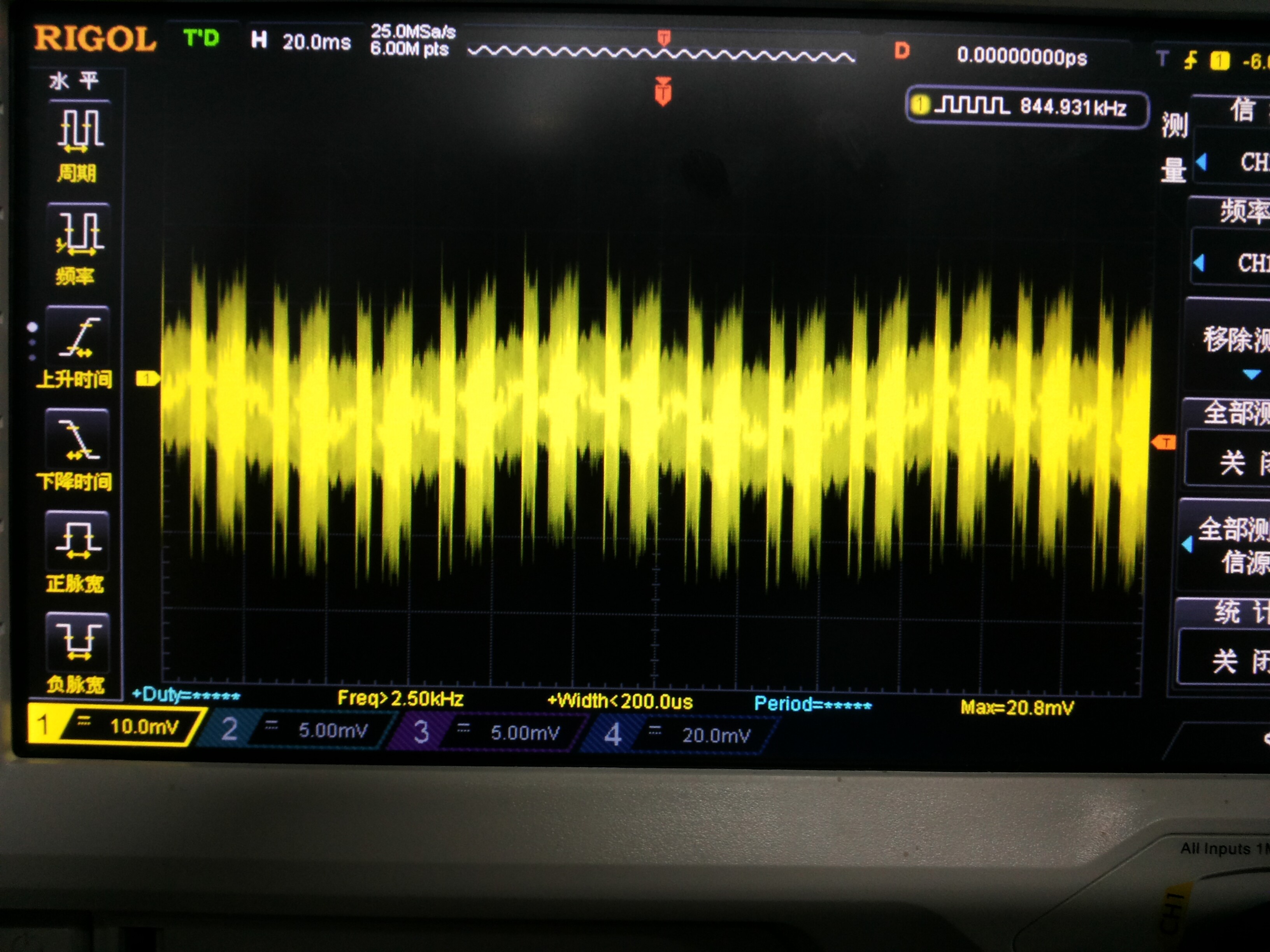 仔细看了一下示波器打到10mv档 如果用高阻探头基本已经无法测量 采样噪声比较大 另外如果你分压电阻选的偏大 也足以产生毫伏级的噪声