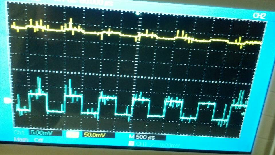 如果我改变LMF100的时钟频率,叠加的方波频率也跟着改变。附件上黄色的表示LMF100出来的信号(为了排除故障,我的信号输入是200mV直流电压),从上面可以看到叠加上了方波。蓝色表笔我是用交流测试看到的,这个看起来就更清楚了。有知道原因的吗