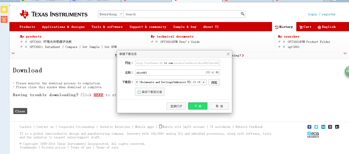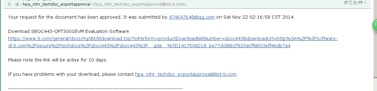 你直接在EVM产品主页上点击“OPT3001EVM Evaluation Software ”,点进去之后需要填写相关信息(比如姓名,邮箱,公司名称,用此软件用在哪些终端产品上),然后提交进行申请就行。