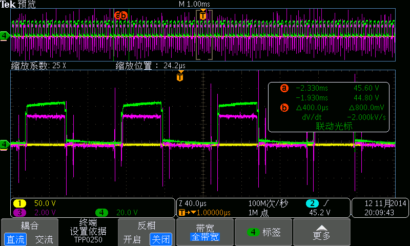 附件是一个PWM输入(紫色)与输出(绿色)的对比波形,可以看出输出波形已经有些畸变了,没有找出啥原因。