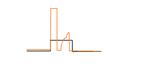 另外一个问题就是在MOS小电流的时候输出PWM波形正常,但MOS电流加大一些的时候 会出现PWM输出波形偶尔出现不正常的波形,示波器的波形图片我搞没了,所以手画一下示意,如下: