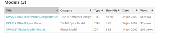 我看了下,TI提供了OPA227的三种模型,有SPice模型,TINA-spice,TINA-reference模型,可直接使用TINA-reference直接仿真。