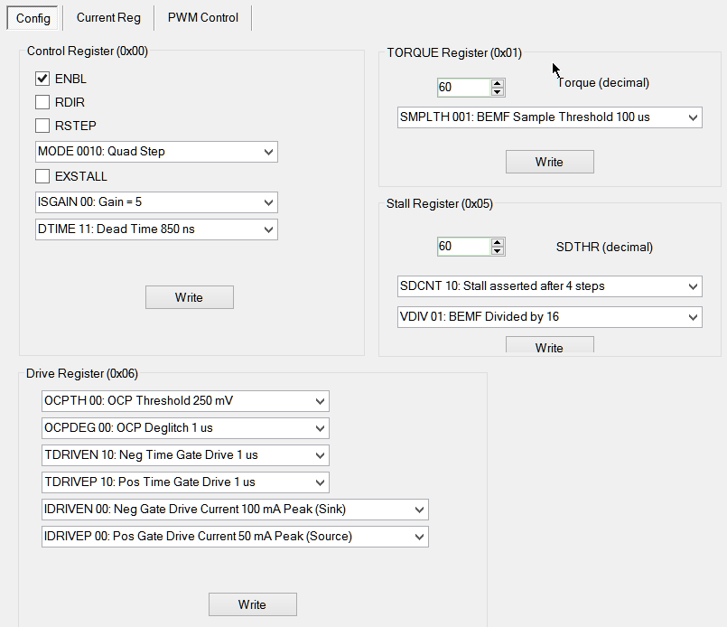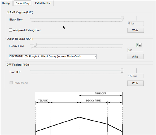 drv8711evm板,电机做快速往复运行(有加减速),供电电压48v,电流感应电阻0.1欧,软件设置如下: