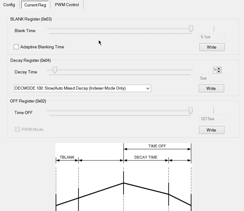 另外上面的decay设置中建议将Blank time设小到1.5us,Time OFF时间也可以设小到20us以下。可以参考DRV8711下的应用文档来设置decay参数,优化电流控制。