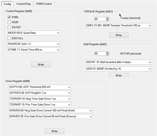 drv8711evm板,驱动步进电机做快速往返运动(有加减速),供电电压48V,电流感应电阻0.1欧,软件配置如下: