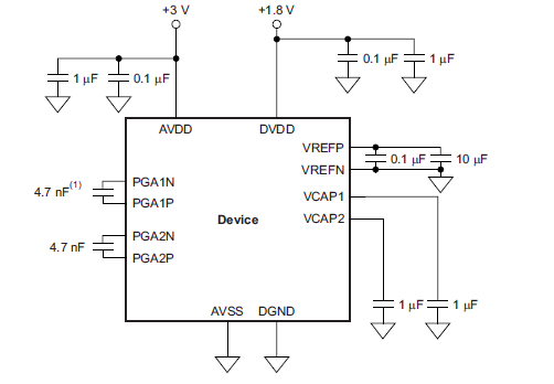 ads1292r的 11 和 27 管脚datasheet中说的是Analog bypass capacitor ,但是ads1292r的用户手册里的原理图中11 和27 接的bypass capacitor 接的地信号是数字地,如图