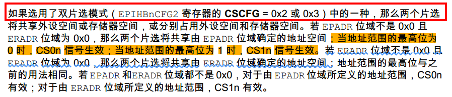 根据资料描述,EPIHB16CFG2寄存器的 CSCFG 位选择 0x3(ALE+双CSn配置)。 EPI0S30 用作地址锁存 (ALE); EPI0S27 用作 CS1n; EPI0S26用作 CS0n。 CS0n 和 CS1n 是否生效均由相应映射空间中的最高地址位决定。