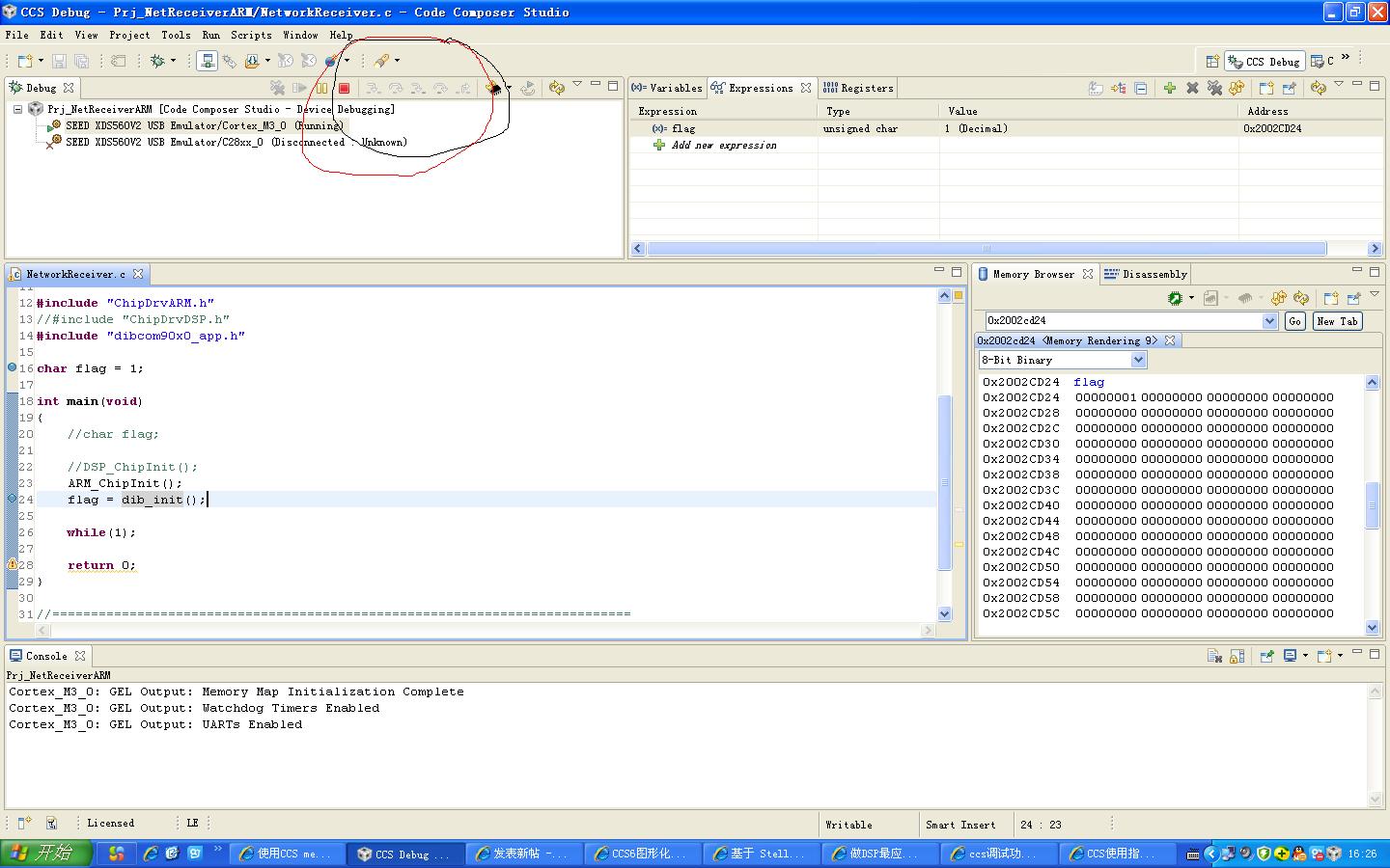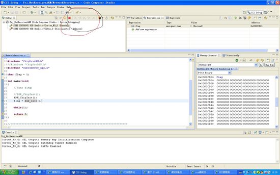 我用ccs设置了两个断电,查看flag变量的值,但step over到第24行时,调试按钮消失,导致我无法看flag变量值。