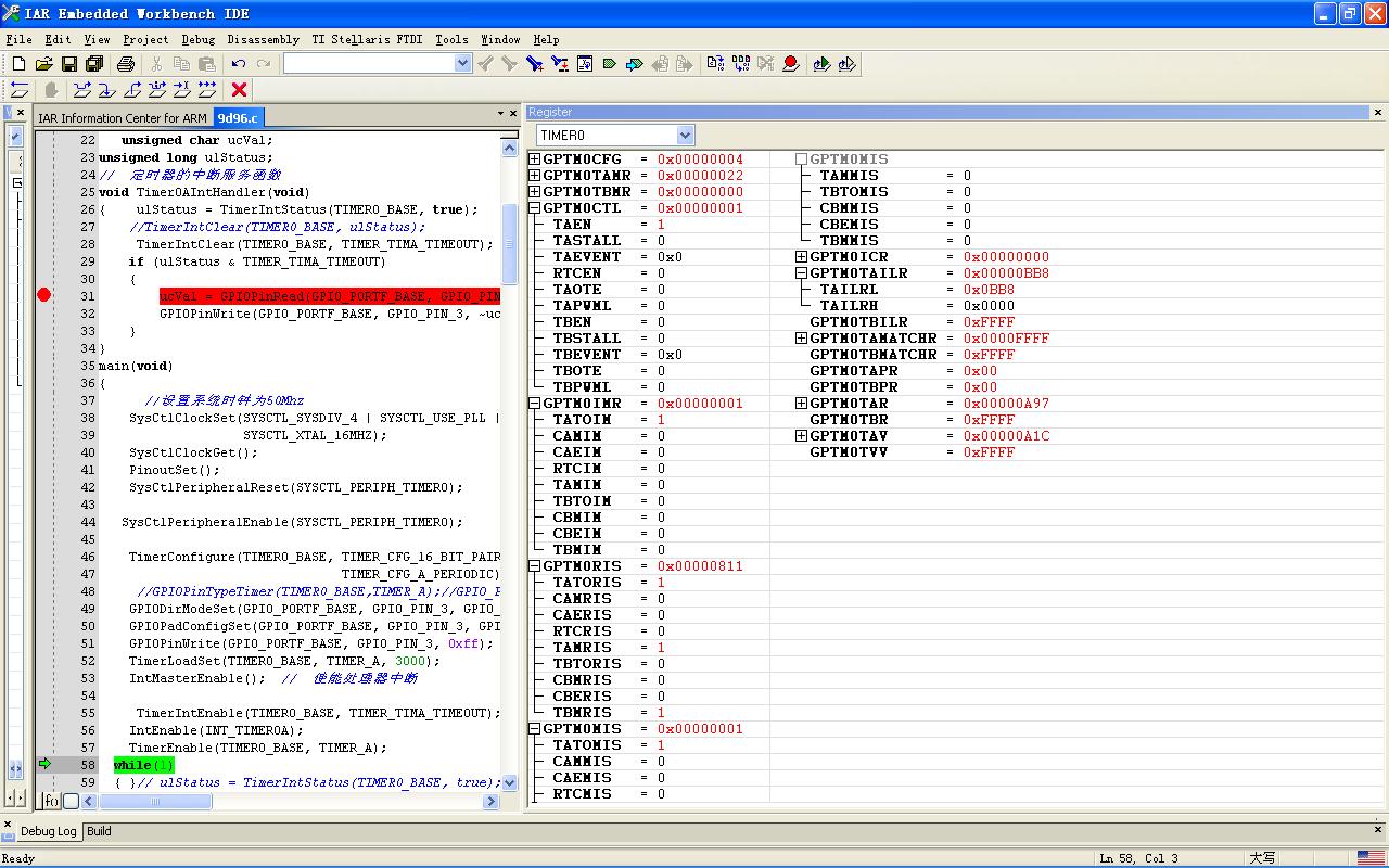 我使用的是LM3S9D96开发板自带的FDTI下载工具,用IAR-embeded-6.20版本软件调试。