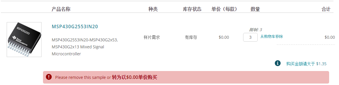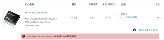 以前都能顺畅的申请样片,但是最近突然出问题了。申请的芯片都是显示的可以申请样片,但是在实际操作中却出现如下图所示的情况。无法结算,请问这是为什么啊?该怎么办呢?