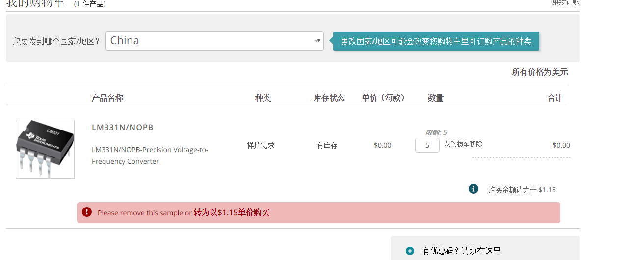 我是研究生一枚,做实验想申请一块LM331的样片,但是,在5块限制范围内,包括一块也不能申请,但是两个月前我用该账户也成功申请了ads1292芯片,为什么第二次申请样片就不能成功呢,周围很多同学也是一样,新注册第一次能申请,到第二次就申请不了呢??