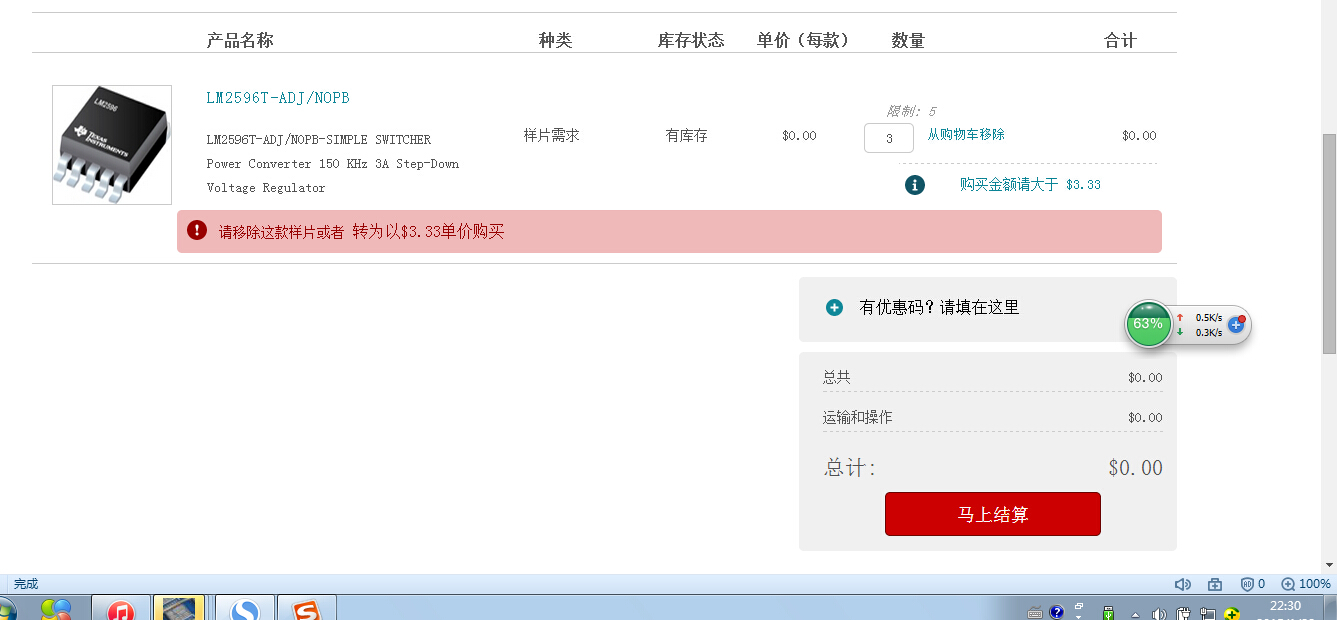 申请已经到了结算那里了,我选的是简体中文的浏览,可是点击马上结算,一直停留在那里没反应,不跳转是咋回事呢,就是附件的图片那里不动了!请TI的员工指点一下呢!