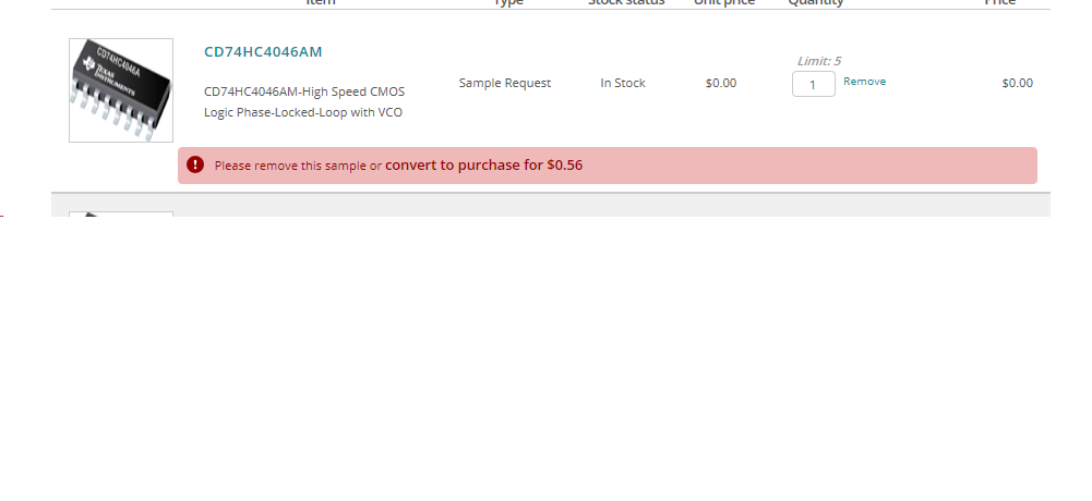 CD74HC4046AM这款型号没有免费样品。如需免费样品请您不要点击“Buy”按钮,请选择“Request sample”按钮,谢谢!