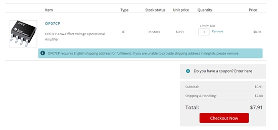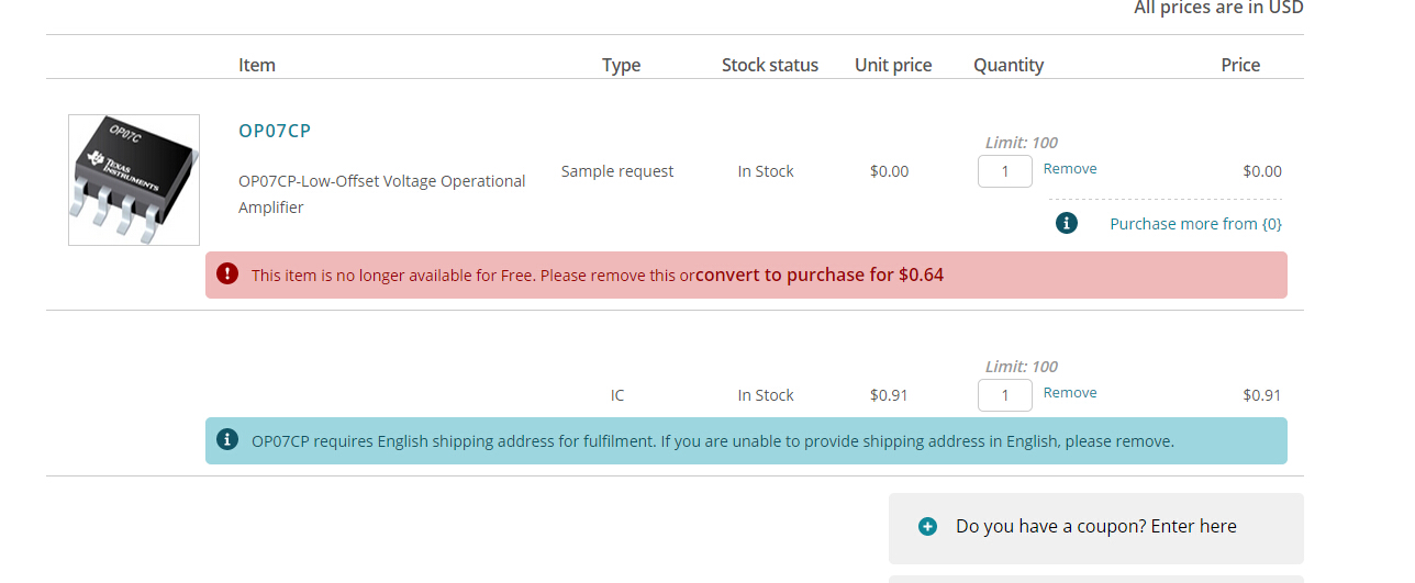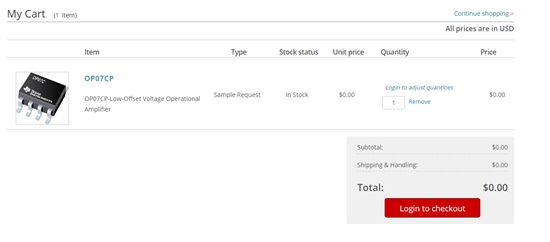 您好!我在申请样片的过程中,每次加入Cart,开始会显示是样片,价格是0,但是加入第二个申请样品或刷新后,就会自动变为IC,价格也是原价。