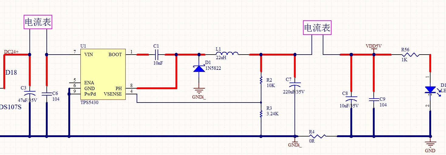 你好,我现在用了一颗TPS5430,24V转5V给我设备供电,测的效率很低只有50%左右,电路图如下,TPS5430输入端:26.26V 22mA,TPS5430输出端:4.84V 67mA,效率只有56.13%。
