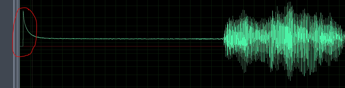 实际音频录制出现如下图示的波形,经过后级功放扬声器播出以后有类似爆破的声音,如果不接MIC也是一样,用的是TI官方程序,每次录制的声音开始时都会有这个声音,