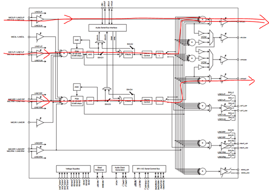 您的意思我理解的是:I2C通过写AIC3106的寄存器可以配置LINEIN两路信号,就是通过寄存器19和22,是这样吗?MIC通过一路DAC我不是很明白,不都应该是由ADC采样吗?我后期处理过的信号还要有两路输出,还望您不吝赐教,非常感谢!Airwill 说:I2C 和 SPI 都可以实现控制, MIC 通过一路 DAC 实现.