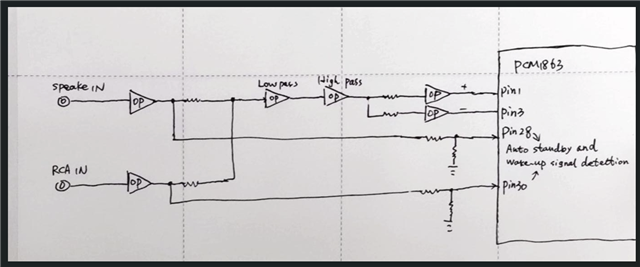The two analog inputs(RCA and Speaker in) are mixed, filtered through high-pass and low-pass filters, and then converted to differential mode to enter PCM PIN1/3 as the audio signal path. Before mixing, the single-ended signals of each are taken and enter PIN28/30 for automatic standby and wake-up detection signals. Can this design approach be realized?