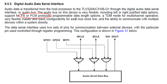 各位TI的工程师,我想问下支持TLV320AIC3104-Q1支持PCM的音频接口吗?Datasheet中说能支持I2S,但是没说能不能支持PCM,我也搞不清楚I2S和PCM之间的关系。