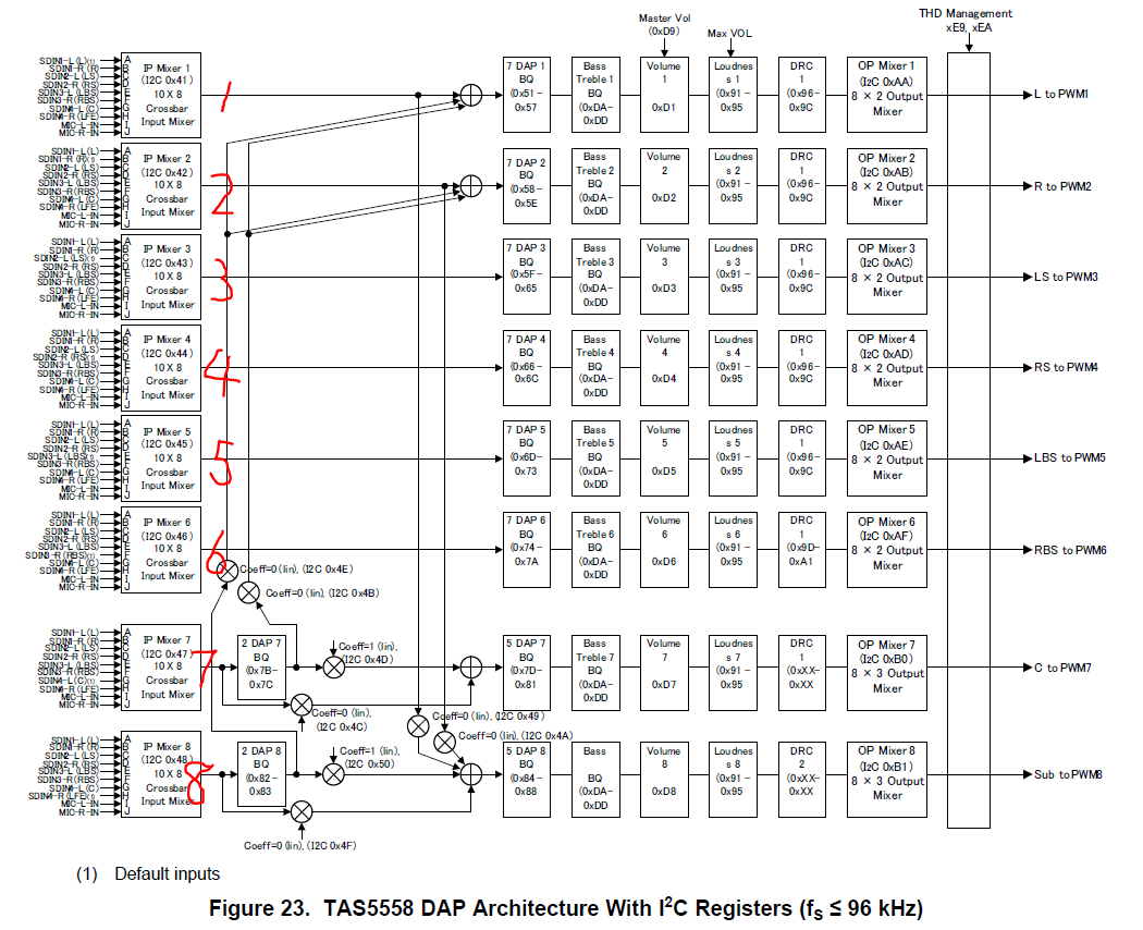 1路24位I2S音频数据经过数字带通滤波器分频变成10路独立输出的I2S。那么使用3个TAS5558可以处理10路I2S,然后独立的输出10路脉冲调制信号到数字功放芯片这样可以吗?主要原因是单块tas5558能同时处理4路24位的I2S数据吗?同时让4路数据独立的处理,独立的输出。谢谢了!觉得我的这方案难吗?