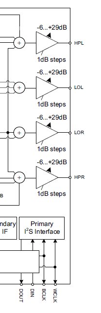 TLV320AIC3204 数字I2S输入音量调节最小音量只能-6dB吗?看了芯片数据表芯片的框图和软件音量配置,发现数字I2S输入是音量增益范围是-6到+29dB。这个最低-6DB的音量衰减,也就是信号输出幅值是减半,对一音量控制来说还是不够低,还是有一半的音量。不能将音量减的很小!这样这个芯片的音量控制实用性就大大的下降了! 请教TI的工程师,软件里还有没有其他方法将I2S输入的音量控制扩展的到很大范围!