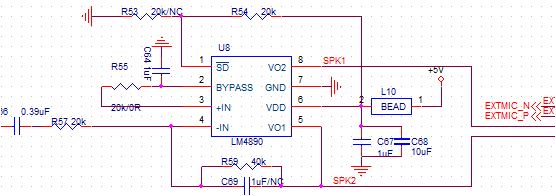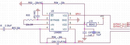 我做了一个音频功放电路,用的是MSOP封装的LM4890。电路基本上就是按照参考设计来了,参考设计上如果是单端输入的话+端应该直接连接BYPASS端,我这里因为有两种输入情况,一种是差分输入一种是单端输入(原理图只示意了单端的情况),所以+端接了20K电阻,其余是参考设计一致。