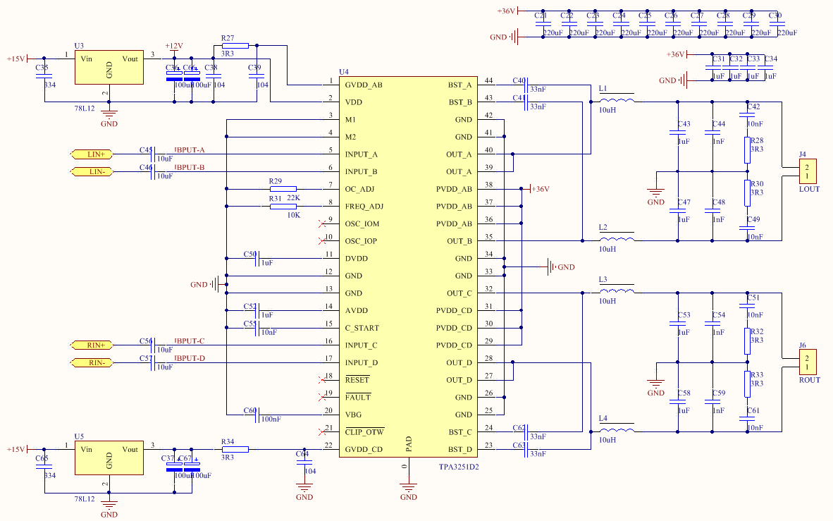 由于输出功率不是很大,所以就没有应用RESET、 CLIP_OTW 、 FAULT三个引脚,但是测试后发现输出没有声音,前级测试信号都到了TDA3251 INPUT引脚,这个问题是出在哪里,这三个引脚是不是必须的