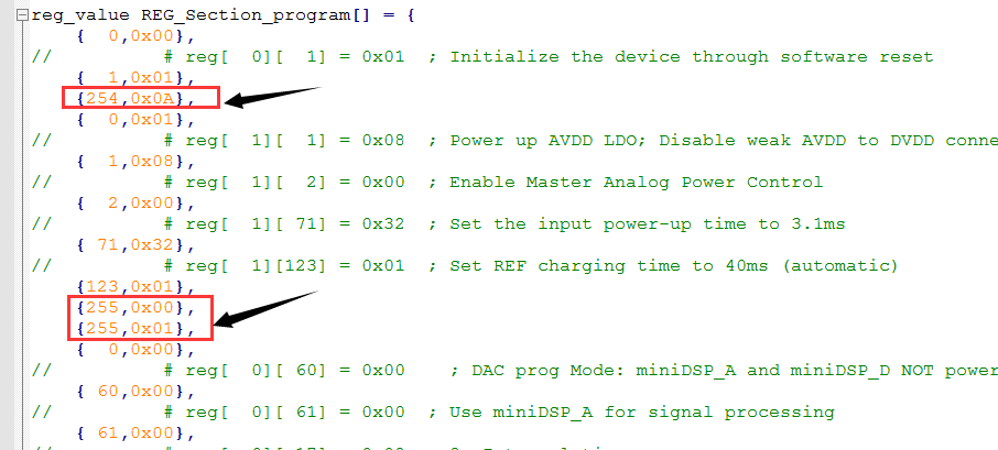 不是说AIC3254的寄存器每页都只有128个寄存器的吗,那么寄存器的最大地址应该是127啊,下图是PPS生成的base_main_Rate44_pps_driver.h文件,里面对寄存器的配置怎么出现了地址为254  和 255的配置啊,这三句话的作用是什么?在哪里能看到相关的资料?求大神解答