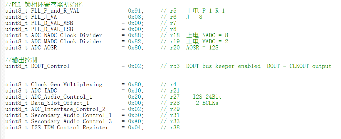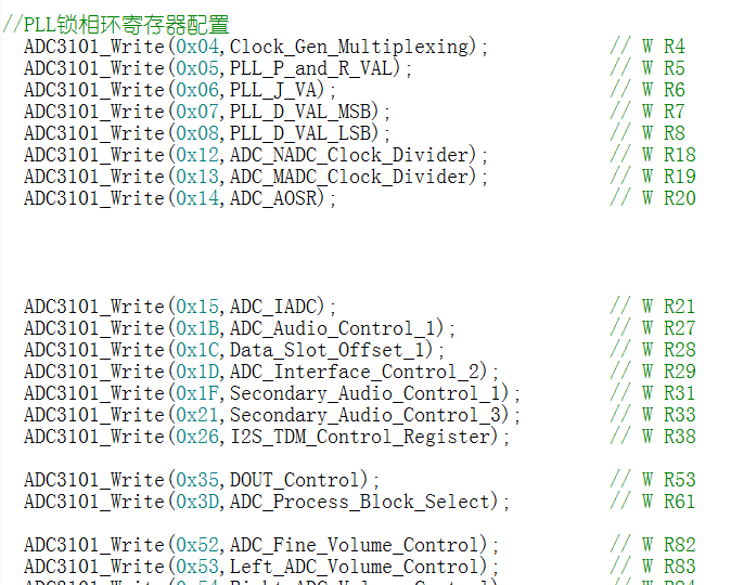 目前3个时钟都是正常,均为外部时钟,MCLK = 12.288M, BCLK = 3.08M,WCLK = 48k,输入为模拟信号,输出为I2S  ,   通过单片机的I2C接口配置ADC3101里的寄存器,I2C 读写ADC3101 寄存器都正常  ,DOUT就是没输出波形,请问能不能给个参考的例子 ,就实现一个简单的AD转换功能。让DOUT 能测试到输出波形。