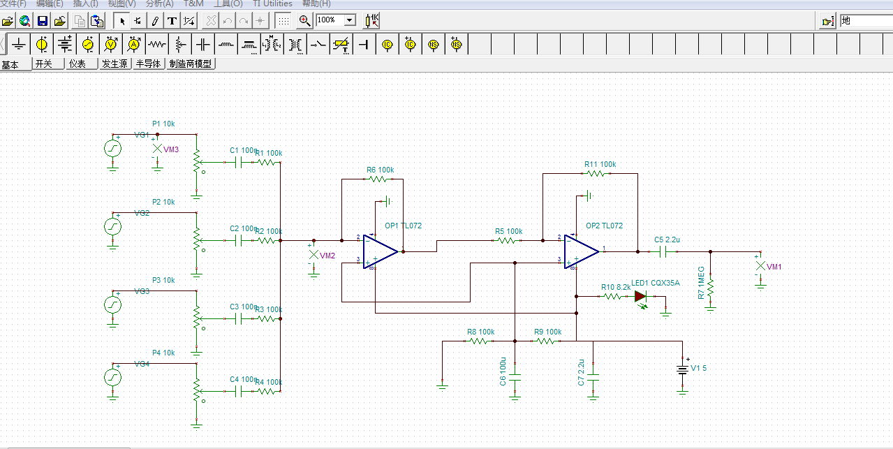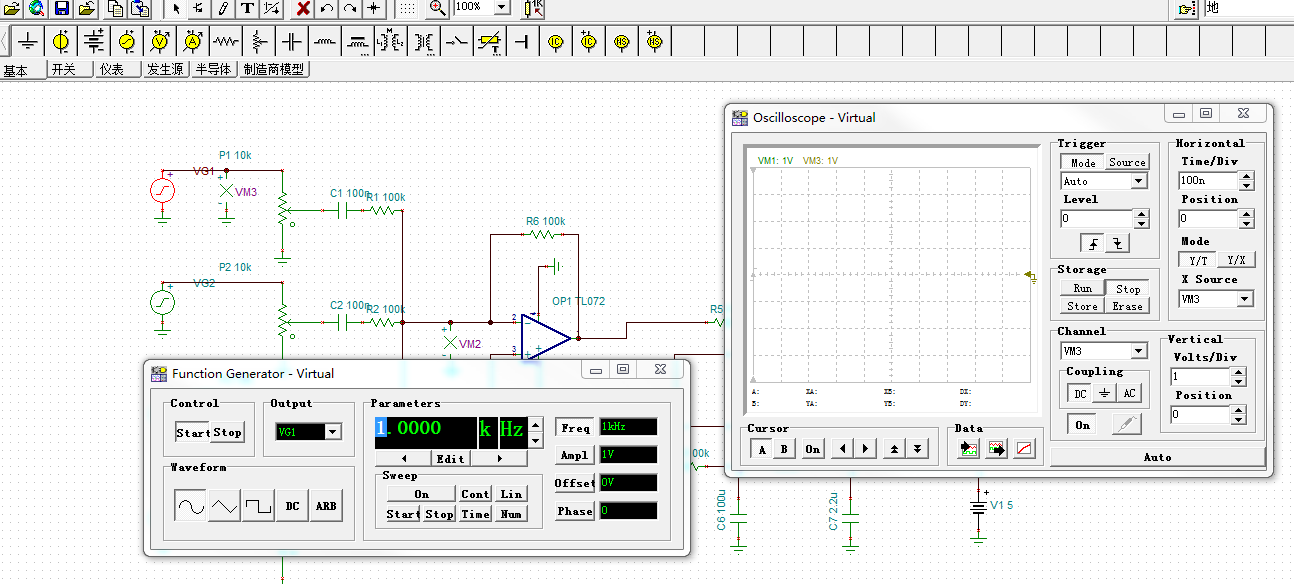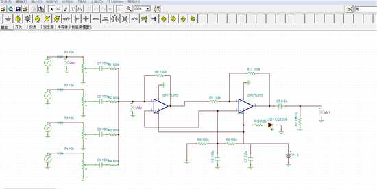 我用tina仿真了一个电路,功能是多路音频合并成一路音频输出,但是我无法用示波器观察到波形,电路图和设置如下,请帮忙解决,感谢