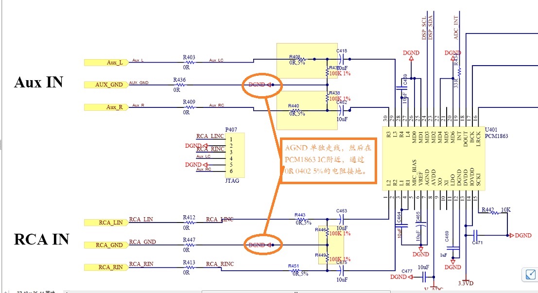 我们在使用PCM1863的时候,往往会把RCA接口的信号,3组线(RCA_L,RCA_R,AGND)一起走线到IC附近,然后在IC 附近把AGND和DGND通过0R 电阻连接到DGND, 相应的RCA_L和RCA_R 信号线上没有添加ESD保护,也没有添加钳位二极管。