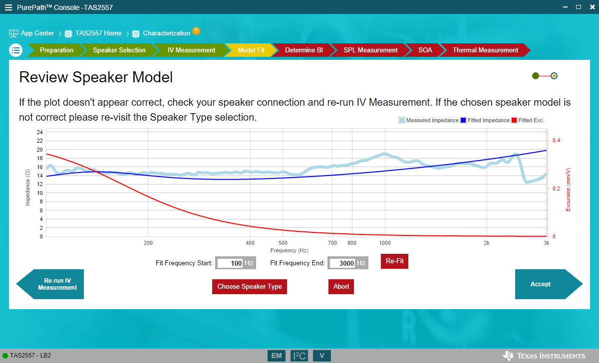 如图,我用TAS2557EVM进行测试,PPC3突然没办法正确拟合扬声器模型了,之前做的时候是可以拟合的。错误结果如图