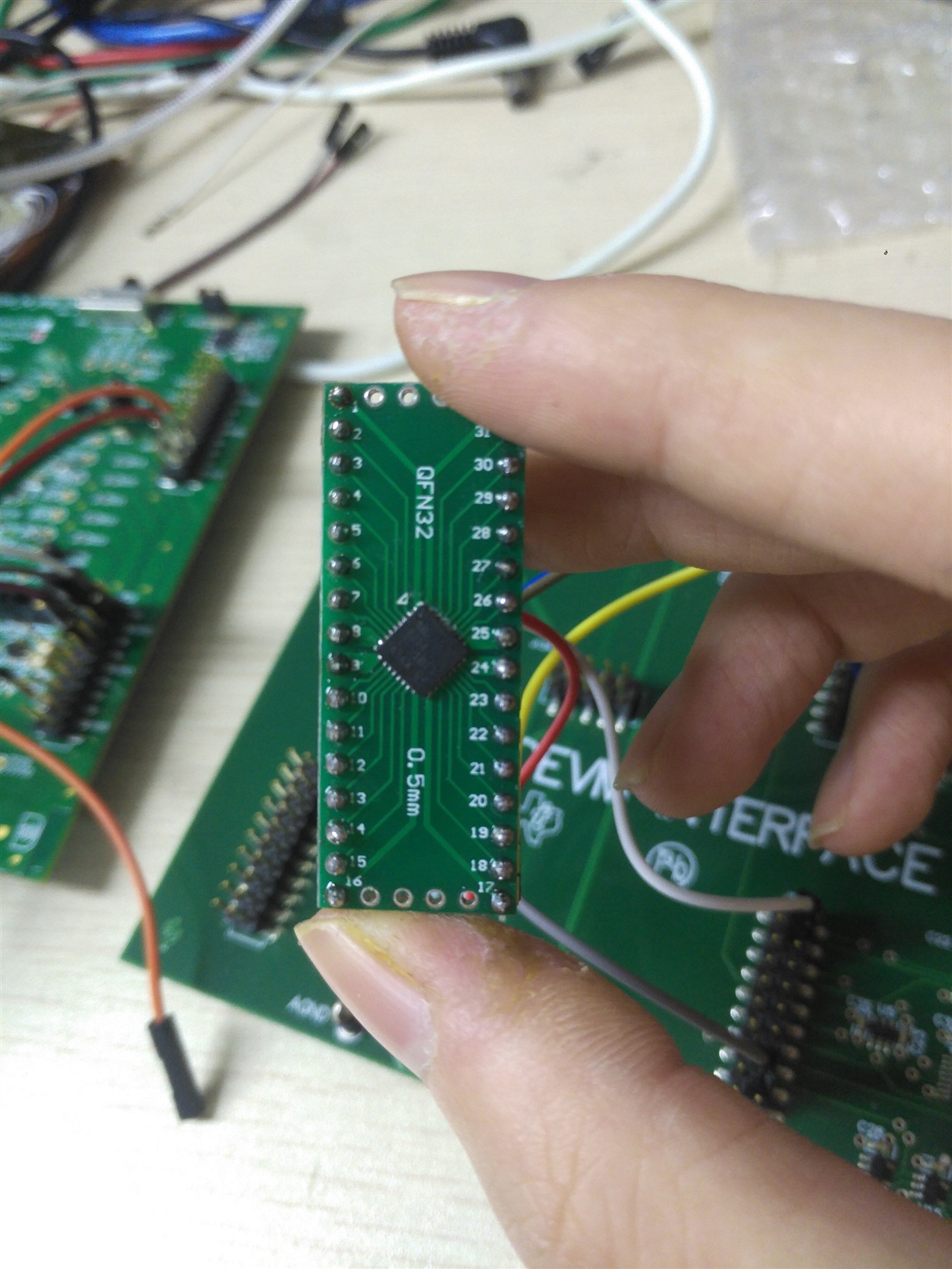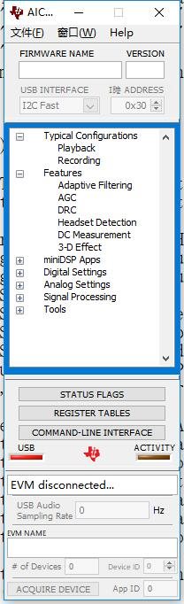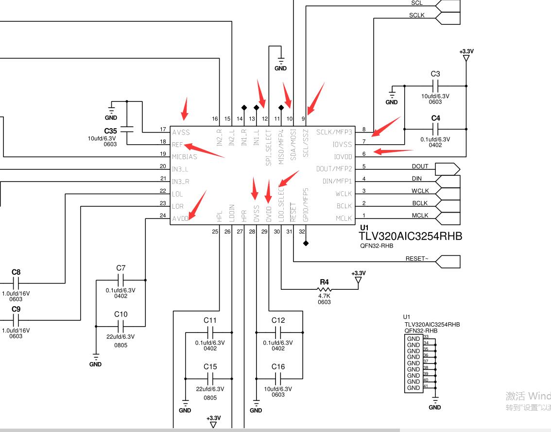 如题,我自己买了AIC3254的芯片和QFN32的转接板,用来搭建一个我自己的评估测试板,现在按照原理图连接了IOVDD/DVDD/DVSS/I2C_SCL/I2C_SDA等引脚到评估板底板上,可是打开CS软件发现找不到设备,USB通信的灯也没有亮,读取寄存器数值也全是OXFF,请问这个是为什么呢?还有哪些关键性引脚没连上呢?