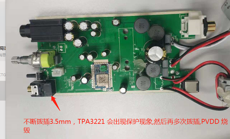 状况1:播放音乐信号正常, 烧机正常, 但在不断重复拔插3.5mm line 输入时 ,TPA3221 PVDD ,经常被烧毁.