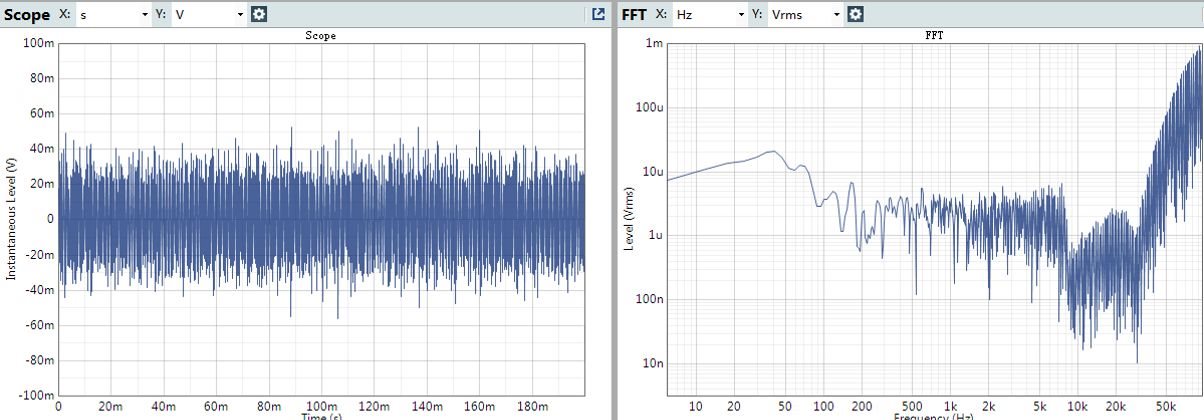 测试DAC输出管脚,上图中左侧为时域,右侧为fft频率图谱。噪声达正负50mVpp,50kHz以上噪声直线增加。这个芯片输出噪声就是这么大吗?