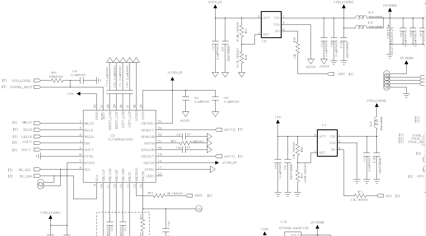 void InitCodec() { volatile unsigned int delay = 0xFFF; /* Select Page 0 */ CodecRegWrite(AIC31_P0_REG0, 0,sizeof(CodecWrite)); /* Reset the codec */ CodecRegWrite(AIC31_P0_REG1, AIC31_RESET,sizeof(CodecWrite)); while(delay--); CodecRegWrite(AIC31_P0_REG9, (0u << 6u | 2u << 4u),sizeof(CodecWrite)); CodecRegWrite(AIC31_P0_REG10, 0,sizeof(CodecWrite)); CodecRegWrite( AIC31_P0_REG8, 0x00,sizeof(CodecWrite)); CodecRegWrite(AIC31_P0_REG7, 0x0A,sizeof(CodecWrite)); //set ADC CodecRegWrite(AIC31_P0_REG15, 0x00,sizeof(CodecWrite)); CodecRegWrite(AIC31_P0_REG16, 0x00,sizeof(CodecWrite)); CodecRegWrite(AIC31_P0_REG17, 0x0F,sizeof(CodecWrite)); //CodecRegWrite(AIC31_P0_REG18, 0xF0,sizeof(CodecWrite)); CodecRegWrite(AIC31_P0_REG25, 0x40,sizeof(CodecWrite)); CodecRegWrite(AIC31_P0_REG19, 0x7c,sizeof(CodecWrite)); //CodecRegWrite(AIC31_P0_REG22, 0x04,sizeof(CodecWrite)); //set DAC CodecRegWrite(AIC31_P0_REG37, 0xE0,sizeof(CodecWrite)); CodecRegWrite(AIC31_P0_REG41, 0x02,sizeof(CodecWrite)); CodecRegWrite(AIC31_P0_REG42, 0x6C,sizeof(CodecWrite)); CodecRegWrite(AIC31_P0_REG47, 0x80,sizeof(CodecWrite)); //CodecRegWrite(AIC31_P0_REG46, 0x80,sizeof(CodecWrite)); CodecRegWrite(AIC31_P0_REG51, 0x01,sizeof(CodecWrite)); CodecRegWrite(AIC31_P0_REG64, 0x80,sizeof(CodecWrite)); //CodecRegWrite(AIC31_P0_REG63, 0x80,sizeof(CodecWrite)); CodecRegWrite(AIC31_P0_REG65, 0x01,sizeof(CodecWrite)); CodecRegWrite(AIC31_P0_REG43, 0x00,sizeof(CodecWrite)); CodecRegWrite(AIC31_P0_REG44, 0x00,sizeof(CodecWrite)); CyDelay(500);//500ms CodecRegWrite(AIC31_P0_REG51, 0x09,sizeof(CodecWrite)); CodecRegWrite(AIC31_P0_REG65, 0x09,sizeof(CodecWrite)); }