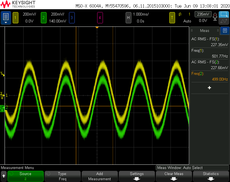 问题:为什么不是手册上讲的707mVrms? 这个707mVrms是怎么来的呢?如果参考电压是3.V,那最大输出的交流信号不应该是3/sqrt(2) = 2.12132Vrms吗?为什么手册中是0.707Vrms? 就算是以1.35V为参考,那也不是0.707mVrms啊?