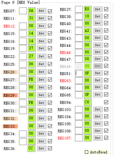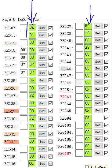 下图为寄Codec的部分寄存器配置,蓝牙箭头指向的列为寄存器的配置值(16进制),REG37表示第37号寄存器;