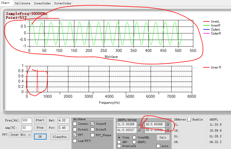 测量办法:用示波器测量MIC1RP引脚的信号,用来与转换的数据对比;MIC1RP上给的是一个500Hz的正弦波,示波器测的的值为226.7mVrms, 而Codec内置ADC的PGA增益与Mixer前端的信号增益均为0dB时,转换出来的数据是397.1mVrms;